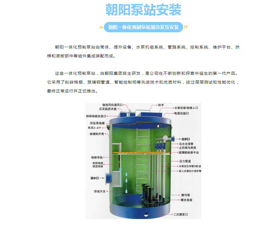 朝陽集團應工業園客戶的具體需求,按時按需完成并發貨。定制的一體化預制泵站,在設計上充分考慮了客戶的實際使用情況,經過嚴格測試和檢驗,確保其性能穩定可靠,壽命長久。