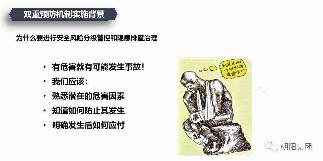 在培訓(xùn)活動(dòng)中,朝陽集團(tuán)申總詳細(xì)給員工講解了風(fēng)險(xiǎn)分級管控、隱患排查治理的概念、方法和流程等,并強(qiáng)調(diào)了雙重預(yù)防機(jī)制在安全生產(chǎn)中的重要性。申總首先對雙重預(yù)防機(jī)制的定義進(jìn)行了闡述,再對風(fēng)險(xiǎn)分級管控與隱患排查治理的雙重預(yù)防機(jī)制進(jìn)行了深入的講解。